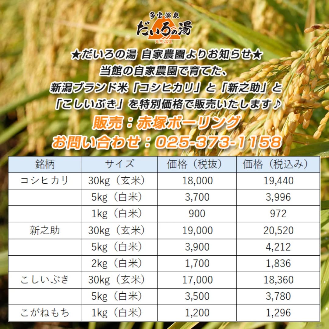 #だいろの湯 #自家農園 #コシヒカリ #こしいぶき #新潟米 #有機農法 #自然の恵み #特別価格 #赤塚ボーリング #メンテナンス中 #お知らせ #お詫び
