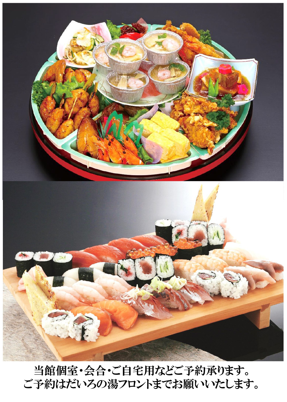 新鮮な海の幸・直営農場直送の野菜・有機栽培コシヒカリ100%など、 当館専属料理人が腕を振るう、豊富なメニューをご用意しております。 湯上りの談笑・団欒にぜひご利用下さい。